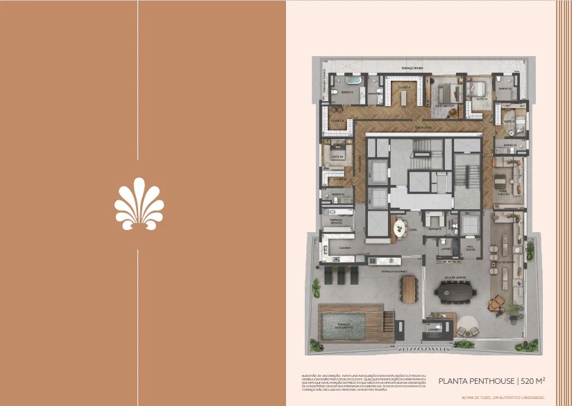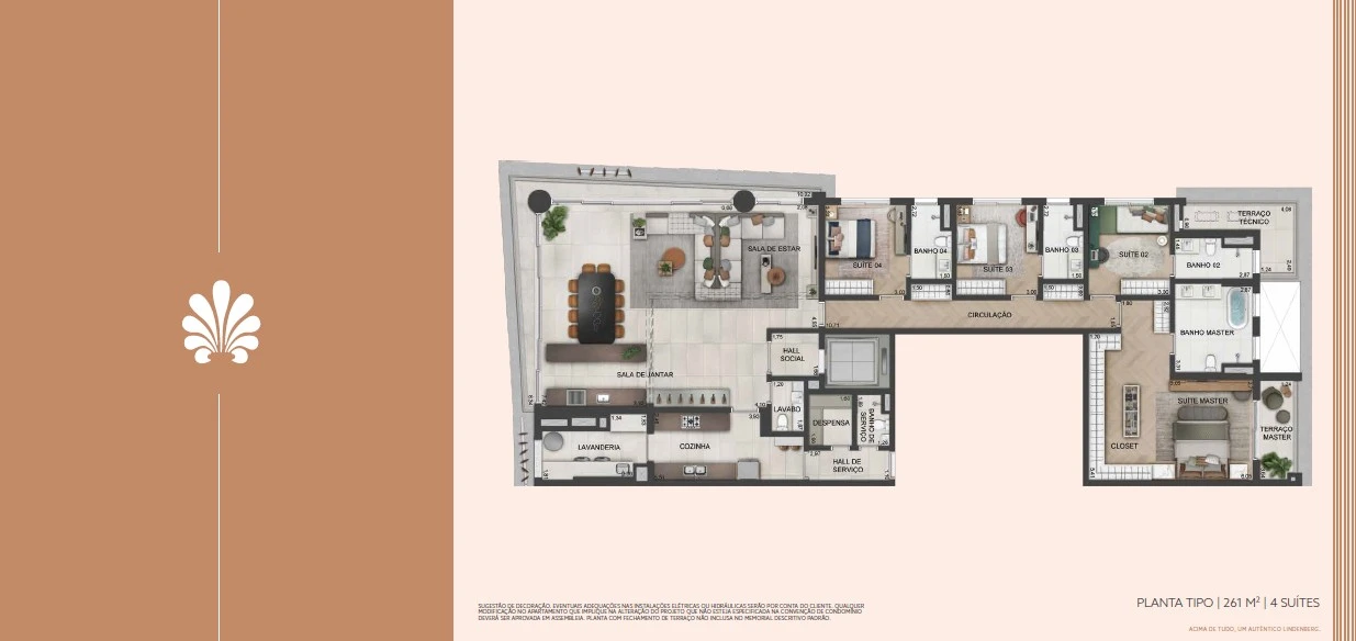 • Unidades com 4 suítes, 4 a 6 vagas de garagem e depósito privativo.