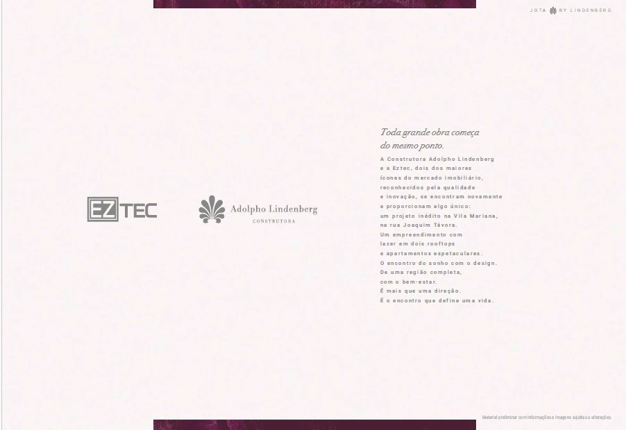 O Jota Vila Mariana é um empreendimento residencial de alto padrão localizado na no bairro Vila Mariana, em São Paulo. Desenvolvido em parceria pela EZTEC e pela Construtora Adolpho Lindenberg, o projeto combina arquitetura sofisticada, localização privilegiada e infraestrutura completa de lazer.