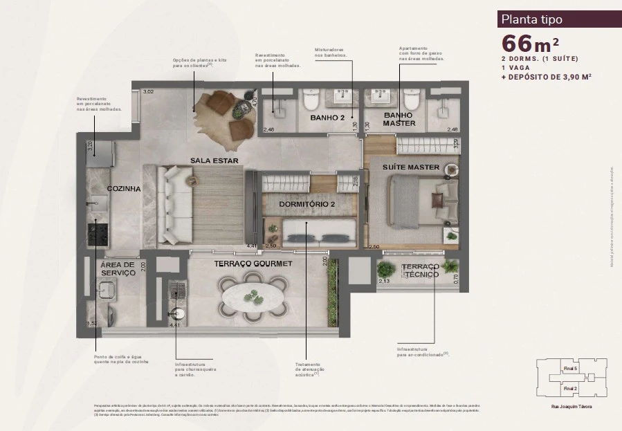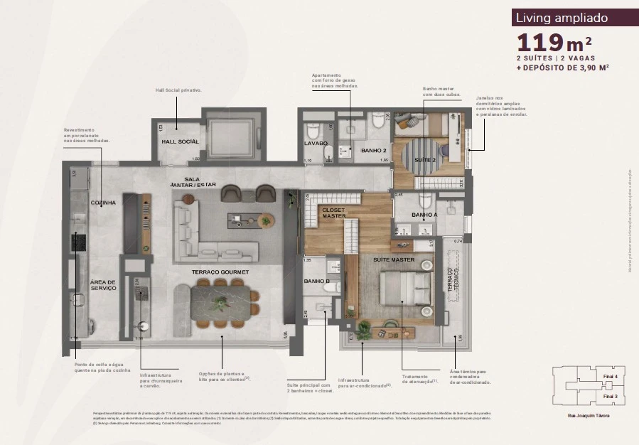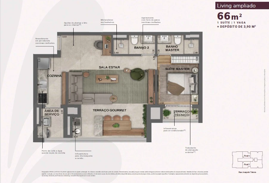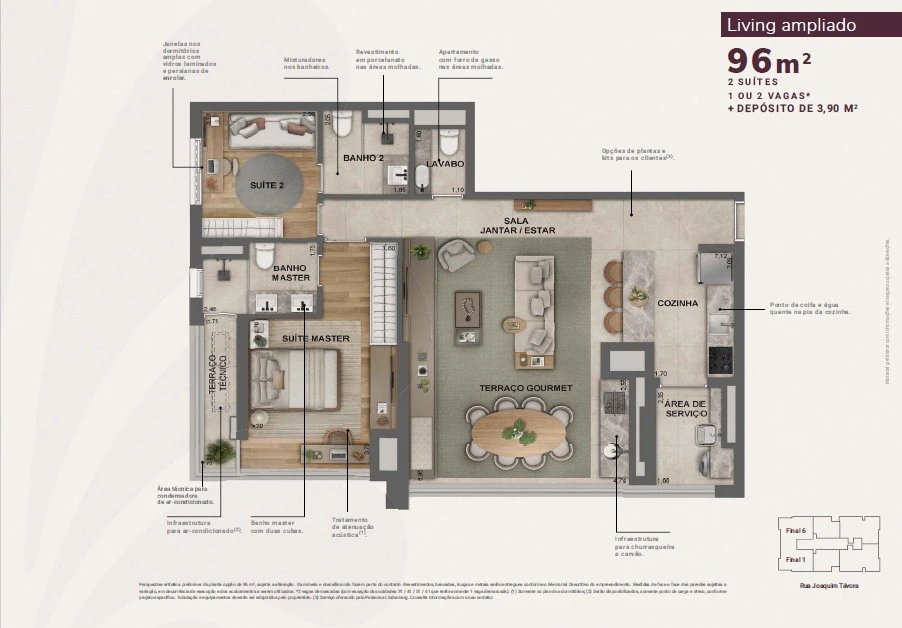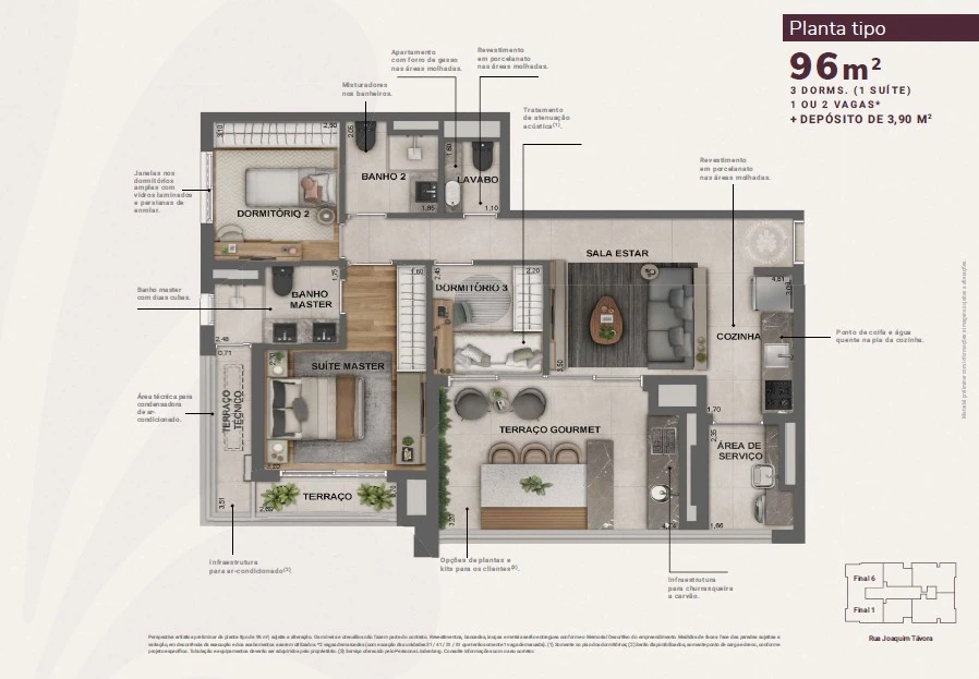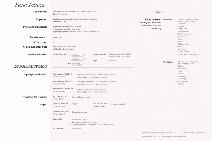 O empreendimento oferece apartamentos e studios com plantas inteligentes que variam aproximadamente de 22 m² a 120 m², atendendo diferentes perfis de moradores e investidores. O projeto foi pensado para unir design contemporâneo, conforto e praticidade em uma das regiões mais valorizadas da cidade, próxima aos parques Ibirapuera e Aclimação e com fácil acesso à Avenida Paulista e ao metrô Ana Rosa.