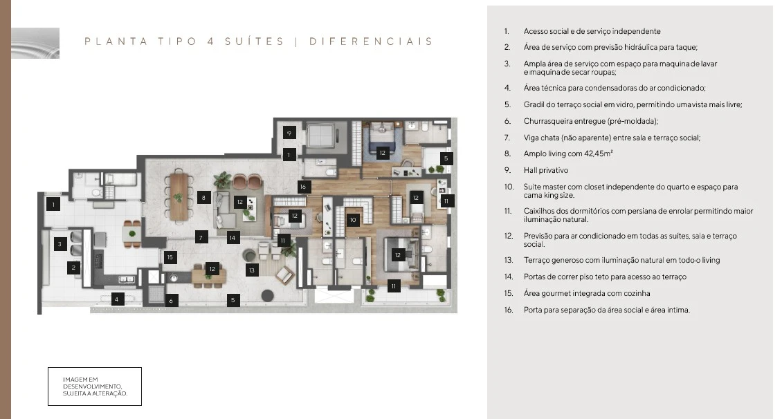 Hall social privativo, Living amplo integrado ao terraço, Terraço gourmet (em muitas unidades), Suíte master com closet e varanda, Planta flexível (possibilidade de ampliação de ambientes), Área de serviço com dependência, foco em conforto, privacidade e alto padrão de acabamento.