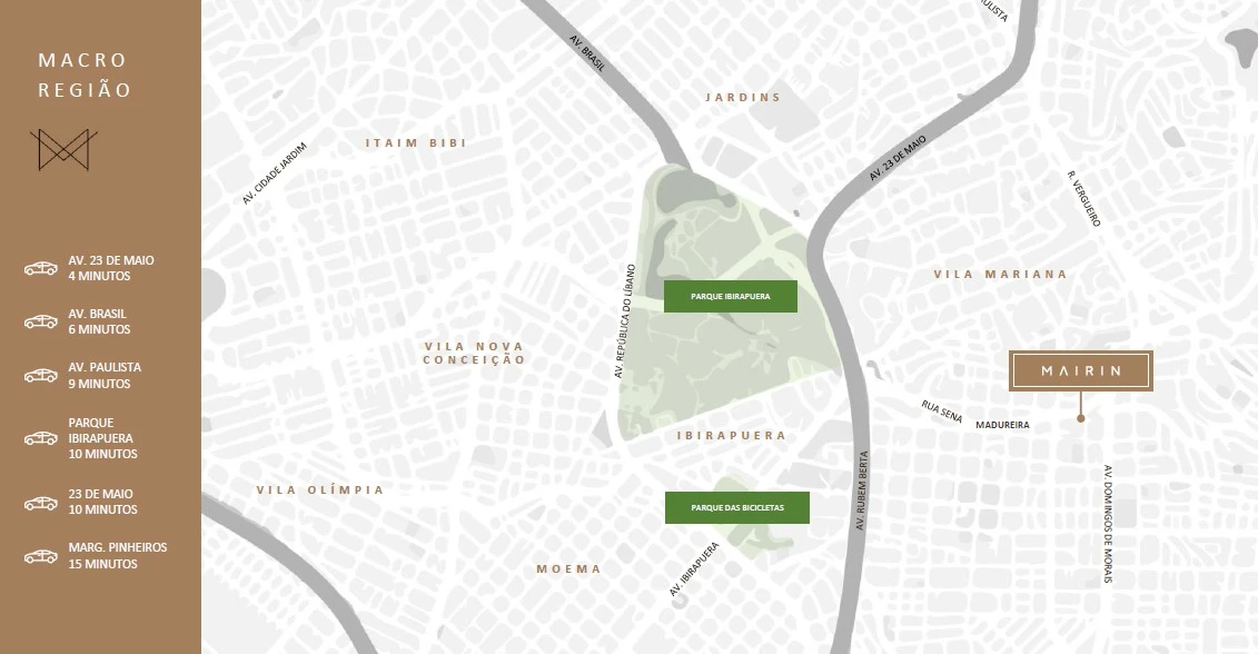 Situado próximo ao Parque Ibirapuera, o projeto fica em uma localização privilegiada entre os bairros Jardins, Moema e Paulista, com excelentes opções de serviços, transporte e lazer nas proximidades, além de fácil acesso às principais vias da cidade.