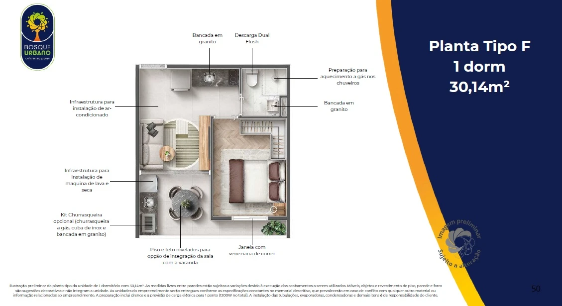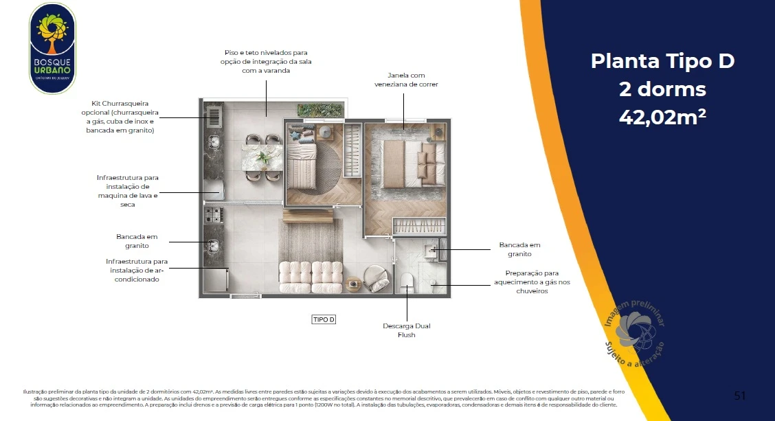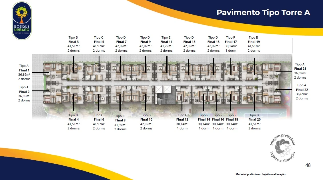 Plantas: 1 e 2 dormitórios, de 30 a 42 m², sem vaga de garagem