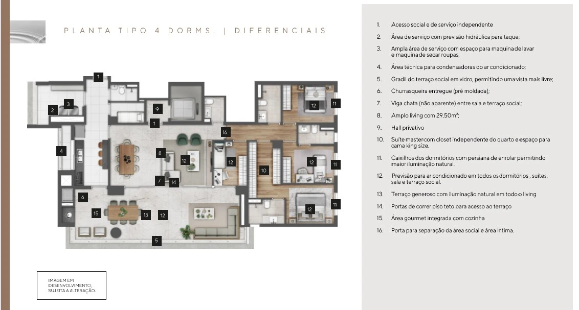 Hall social privativo, Living amplo integrado ao terraço, Terraço gourmet (em muitas unidades), Suíte master com closet e varanda, Planta flexível (possibilidade de ampliação de ambientes), Área de serviço com dependência, foco em conforto, privacidade e alto padrão de acabamento.