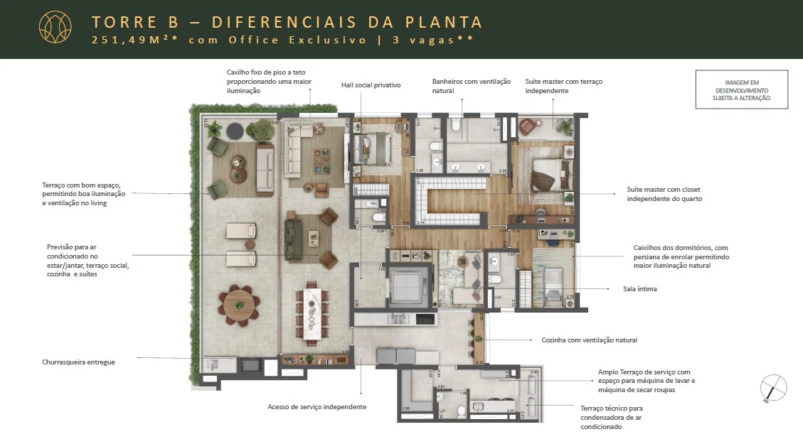 O projeto oferece unidades de 250 a 334 m² com 3 ou 4 suítes e office exclusivo, além de infraestrutura premium com piscina coberta, quadra de tênis, academia e spa, integrando conforto, bem-estar e localização privilegiada.
