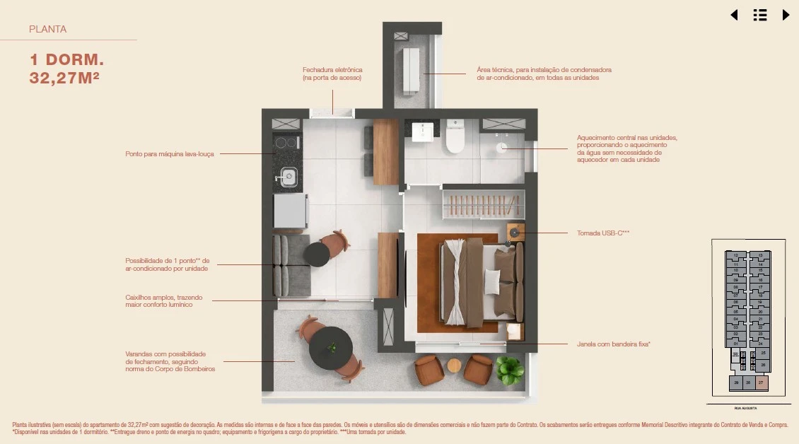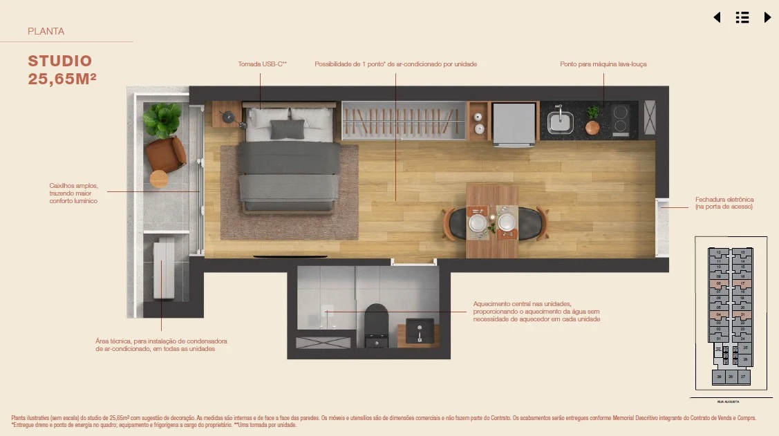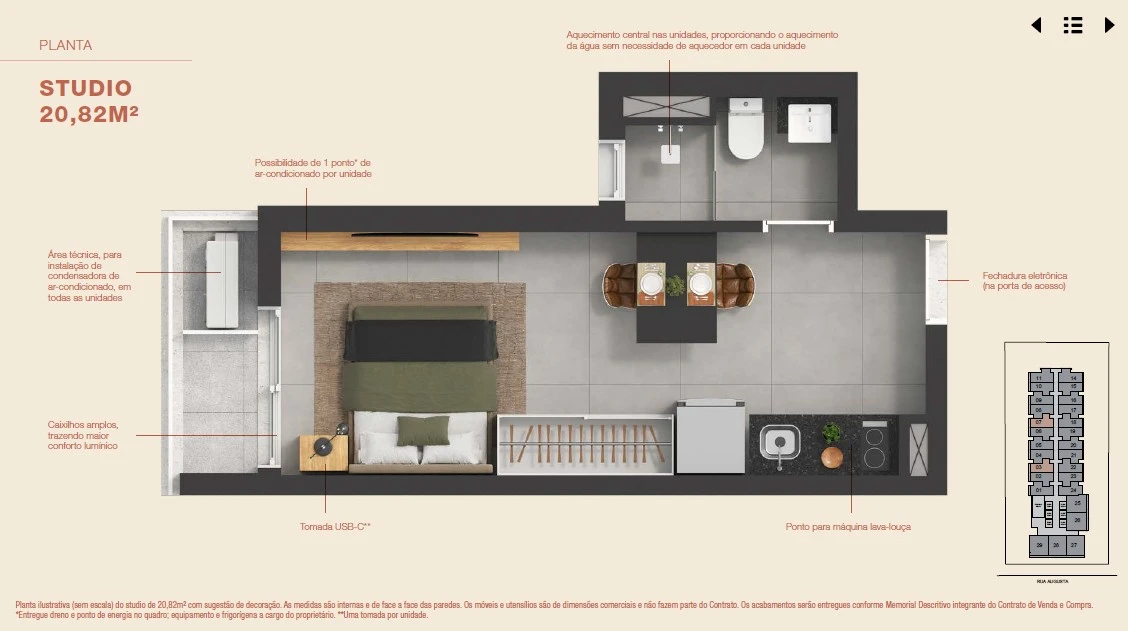 Empreendimento focado em studios e apartamentos compactos, ideais para quem busca praticidade e mobilidade urbana.